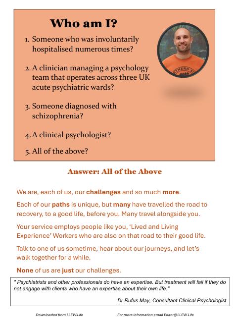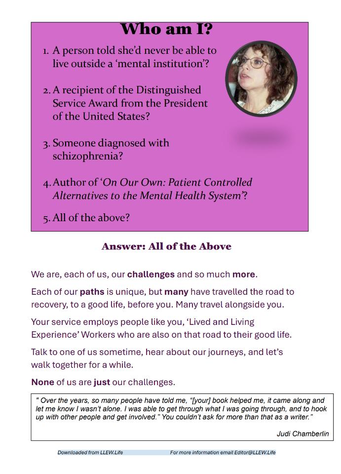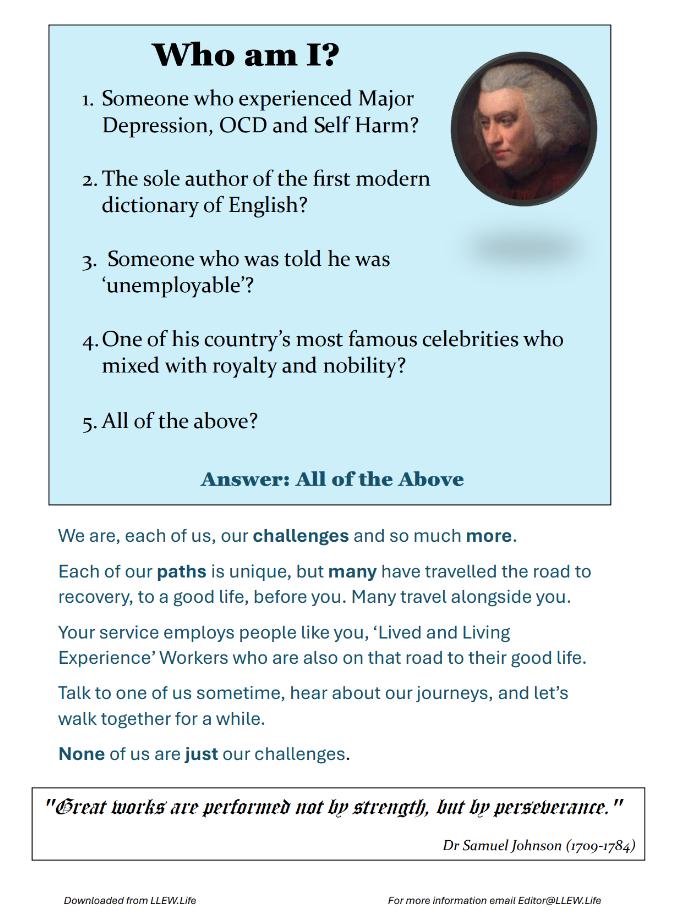 The posters also act as an introduction to the role of LLEW, as further examples of consumers who have earned roles valued in the mental health system.